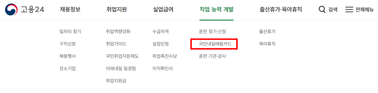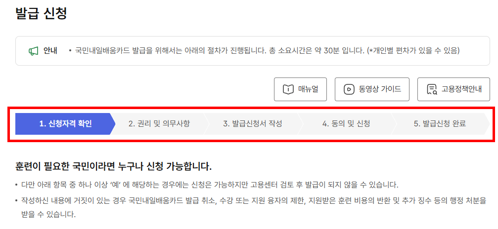 - 상단 메뉴에서 ‘국민내일배움카드’ → ‘발급 신청’ 클릭