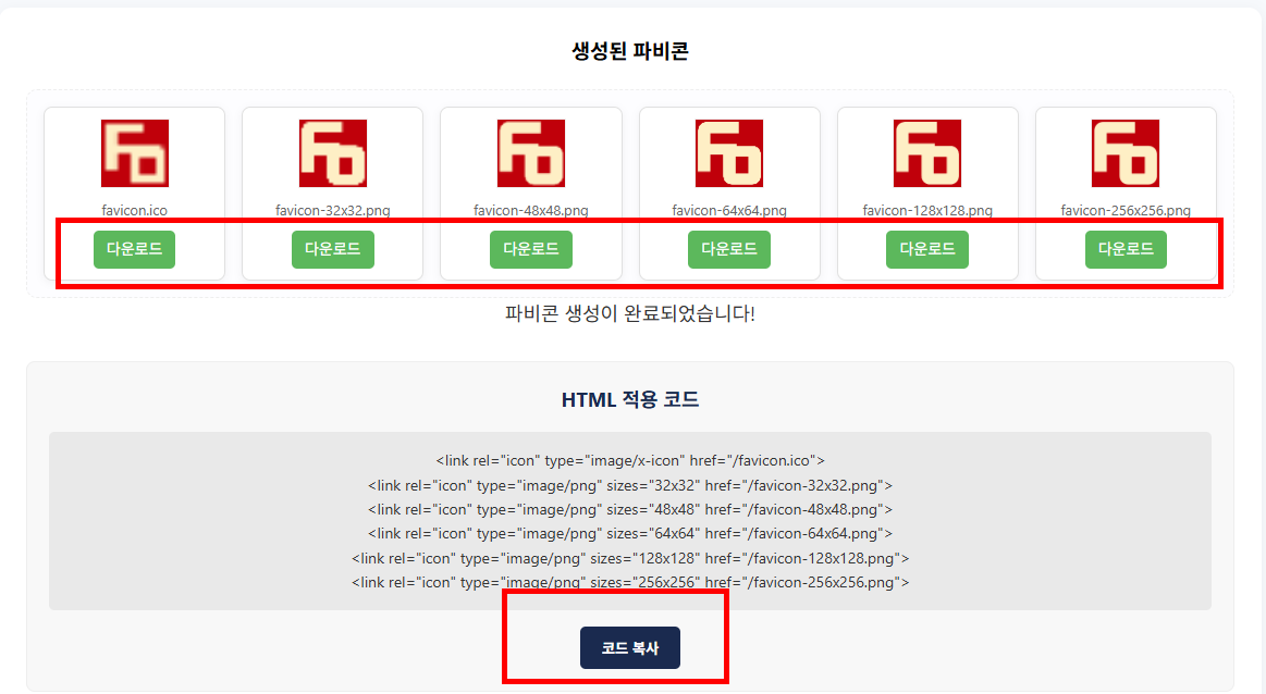 이미지를 업로드하면 바로 파비콘이 생성되어 바로 사용할 수 있습니다.