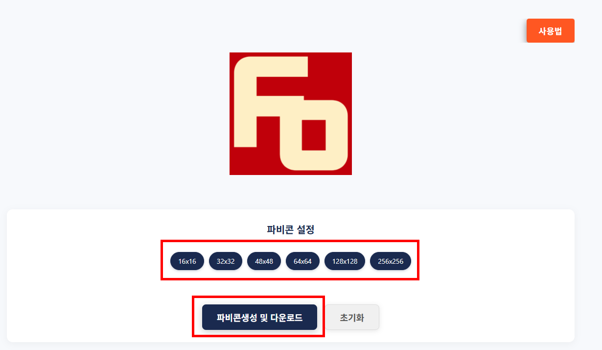 사이즈를 선택한 후 ‘파비콘 생성 및 다운로드’ 버튼을 클릭하면 완료됩니다. 정말 간단하죠!
