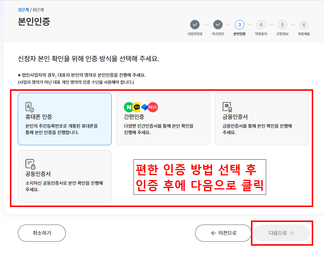 - 인증방법은 총 4가지입니다. 본인이 인증하기 편한 인증방법으로 인증 후 [다음으로] 클릭