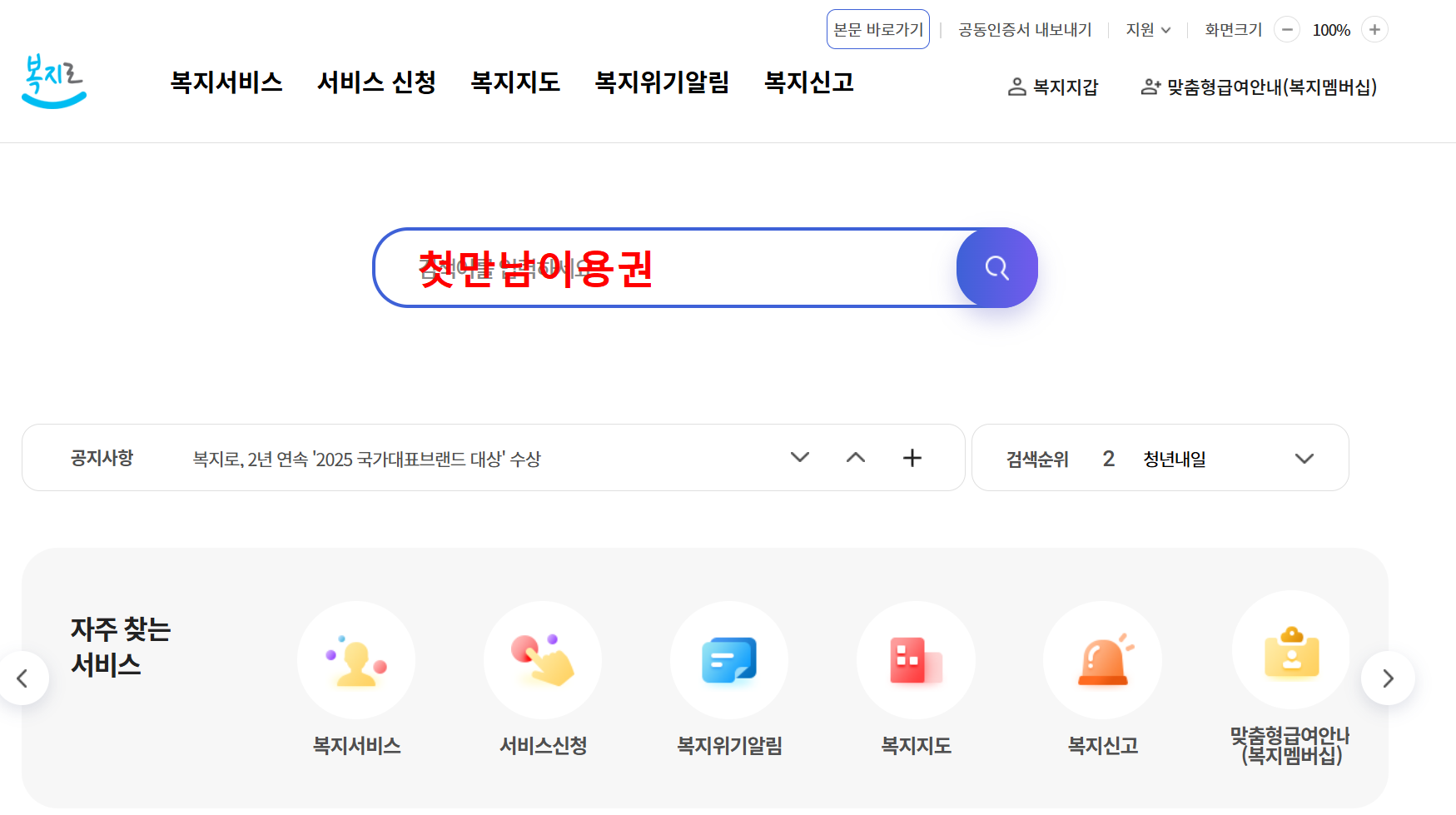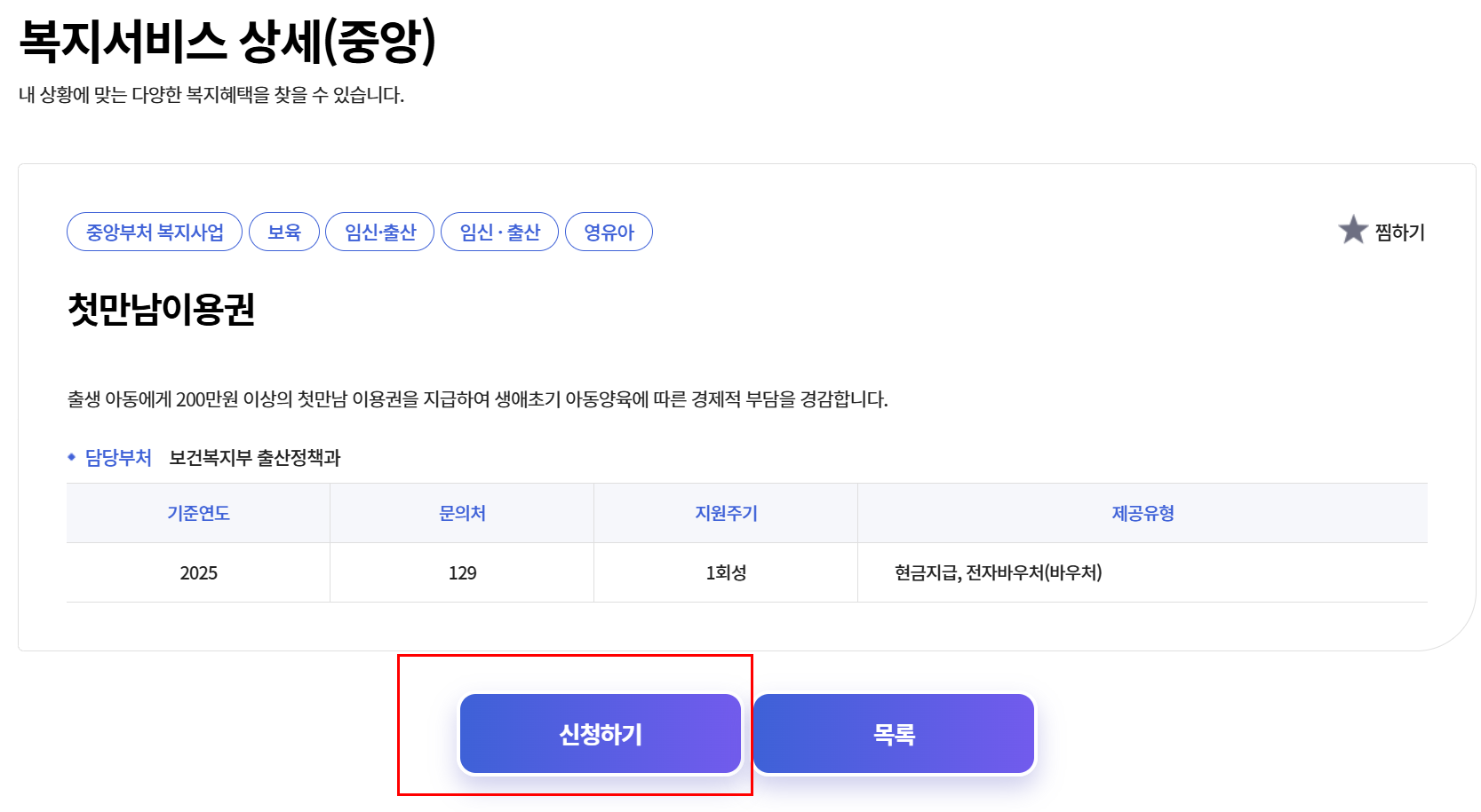- 검색창에 ‘첫만남이용권’ 입력 후 신청 페이지 이동